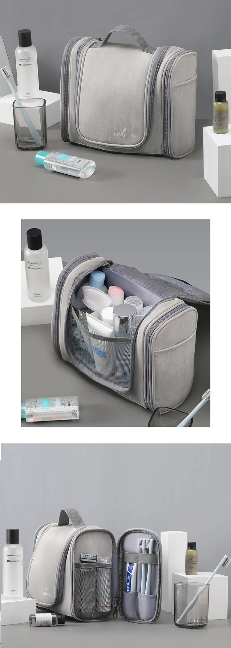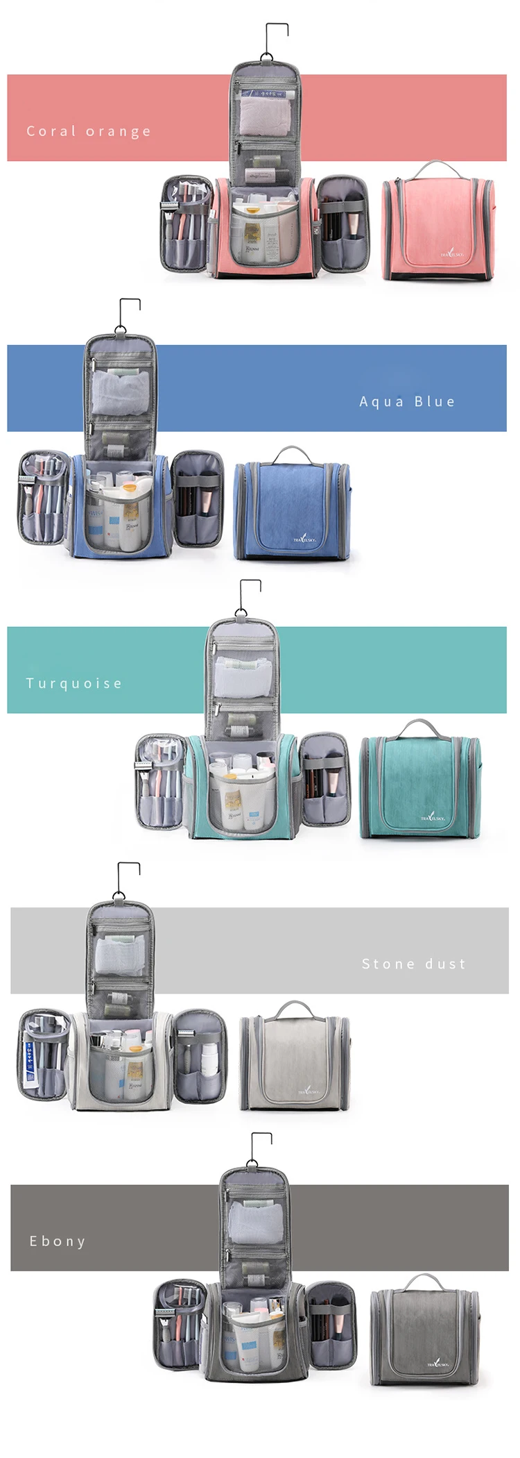 (1)This design wash bag has very large capacity, it can almost place all kinds of essential small items when you travel.